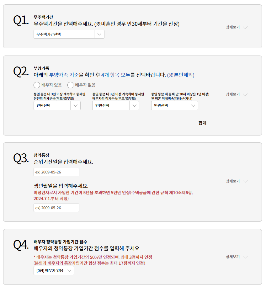 - 무주택기간 / 부양가족 / 청약통장 / 배우자 청약통장 가입기간 입력